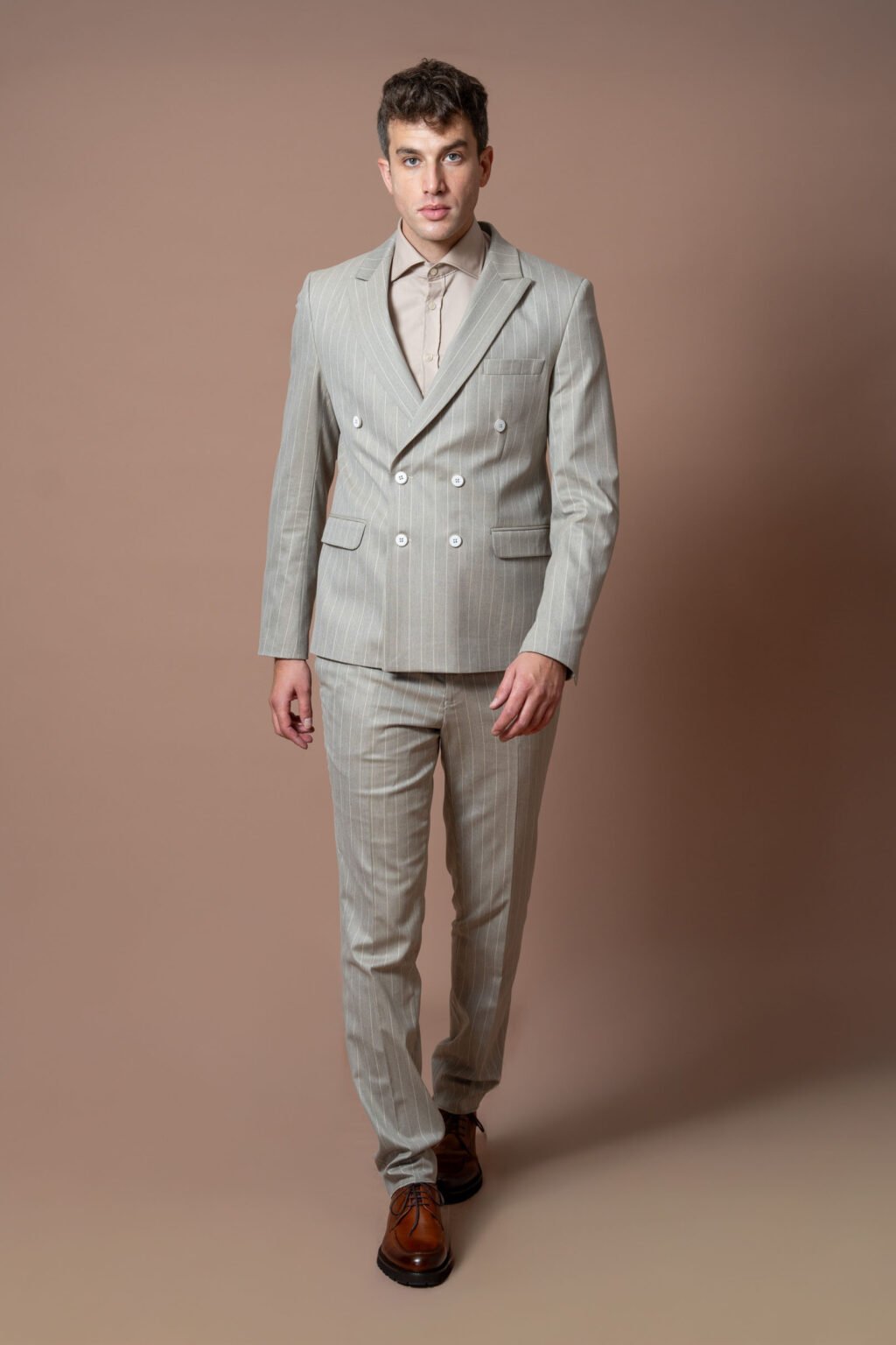Ovo odelo iz kolekcije Martini Vesto spaja klasičnu eleganciju sa savremenim krojem. Izrađeno u bež tonovima sa diskretnim prugama, idealno je za muškarce koji traže sofisticiran, ali nenametljiv poslovni ili svečani izgled. Dvoredno kopčanje sa šest dugmadi naglašava strukturu ramena i donosi notu autoriteta, dok uski kroj prati liniju tela bez gubitka udobnosti. Upareno sa košuljom u neutralnoj nijansi i kožnim cipelama u toplim tonovima, odelo odiše luksuzom i samopouzdanjem.
