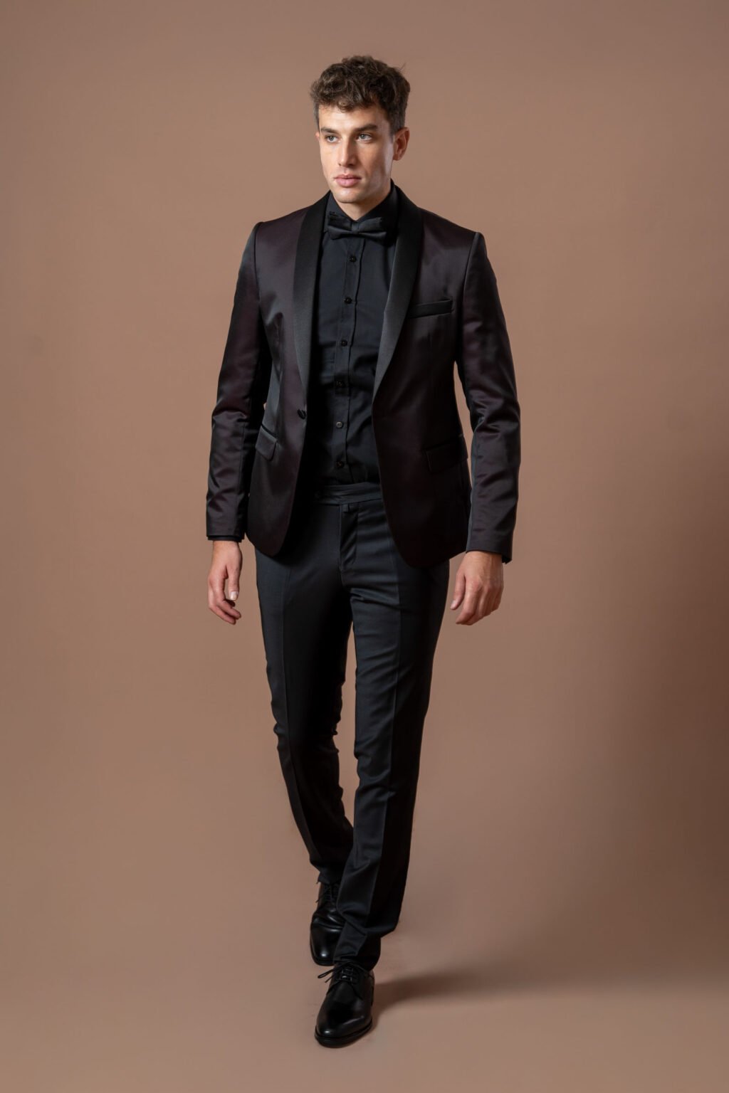 Ovo sofisticirano dvodelno odelo Martini Vesto u nijansi tamnog borda sa satenskim odsjajem predstavlja savremeni izraz večernje elegancije. Sako sa crnom satenskom šal kragnom i preciznim krojem ističe mušku siluetu i unosi notu luksuza, dok crne pantalone pružaju savršen kontrast i uravnotežen vizuelni sklad. Idealno za svečane prilike, gala događaje i večernje izlazke, ovo odelo odiše modernim stilom uz klasičnu profinjenost.