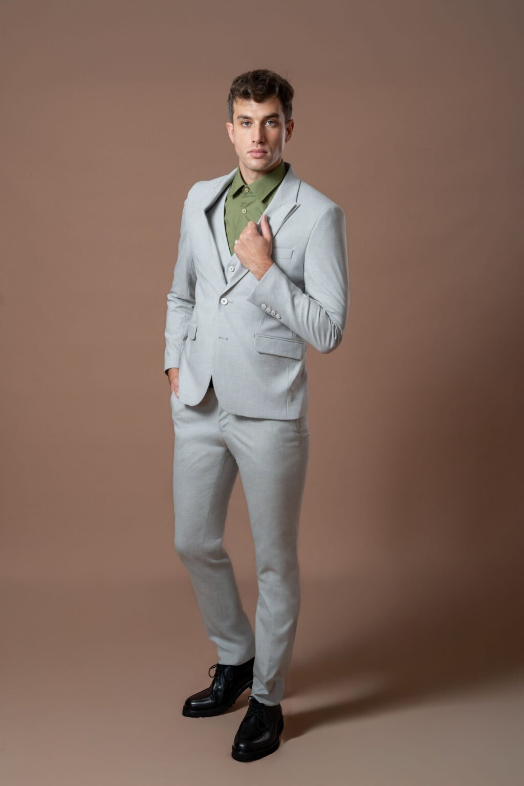 Ovo trodelno svetlosivo odelo Martini Vesto u diskretnom pepito dezenu predstavlja savremenu interpretaciju klasične elegancije. Sastoji se od sakoa, prsluka i pantalona, krojenih sa izuzetnom preciznošću radi naglašavanja muške siluete. Suptilan kontrast tamnosivih pruga unosi dimenziju i teksturalnu dubinu, dok moderna forma i lagana tkanina omogućavaju udobnost tokom celog dana. Odelo je idealan izbor za poslovne sastanke, svečane prilike i urban-smart kombinacije.