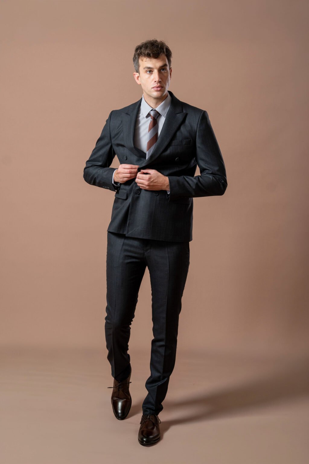 Dvoredno kopčanje dodaje dozu autoriteta i prefinjenosti, dok su pažljivo oblikovani reveri i precizno definisana linija ramena dokaz vrhunskog kroja. Diskretna siva pruga unosi notu dinamike u klasičan izgled, čineći ovo odelo idealnim izborom za poslovne sastanke, svečane prilike ili večernje događaje gde se zahteva stil bez kompromisa.